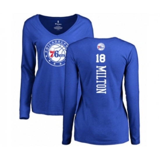 >Basketball Women's Philadelphia 76ers #18 Shake Milton Royal Blue Backer Long Sleeve T-Shirt
