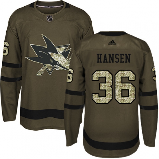 Home>NHL>San Jose Sharks>Jannik Hansen>Men's Adidas San Jose Sharks #36 Jannik Hansen Authentic Green Salute to Service NHL Jersey