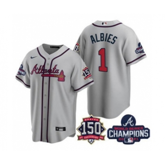 Men's Atlanta Braves #1 Ozzie Albies 2021 Grey World Series Champions With 150th Anniversary Patch Cool Base Stitched Jersey