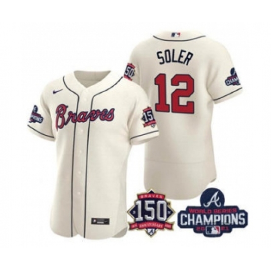 Men's Atlanta Braves #12 Jorge Soler 2021 Cream World Series Champions With 150th Anniversary Flex Base Stitched Jersey