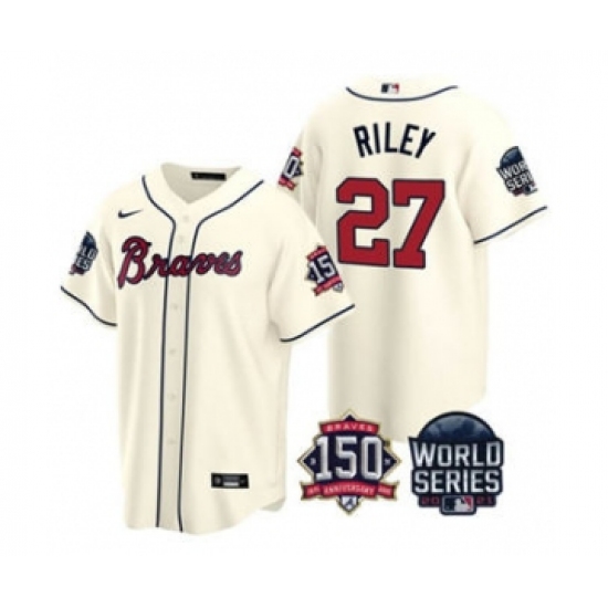 Men's Atlanta Braves #27 Austin Riley 2021 Cream World Series With 150th Anniversary Patch Cool Base Baseball Jersey