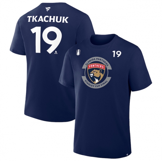 Men's Florida Panthers #19 Matthew Tkachuk Navy 2025 Stanley Cup Final Pro Name & Number T-Shirt