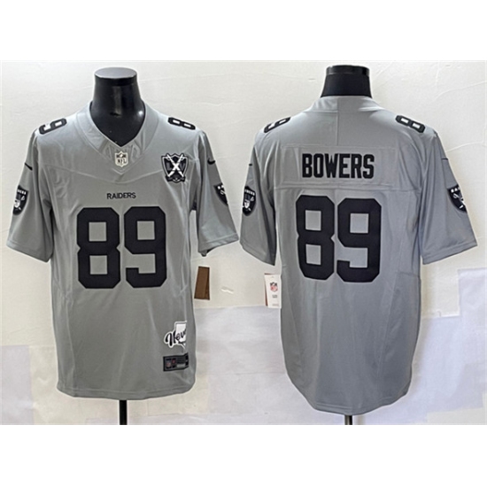 >Men's Las Vegas Raiders #89 Brock Bowers Gray 2024 F.U.S.E With Nevada Silver Stat And 65th Anniversary Stitched Football Jersey