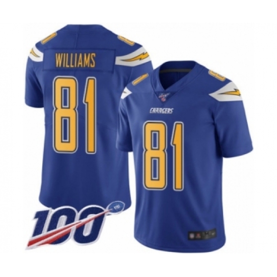 >Men's Los Angeles Chargers #81 Mike Williams Limited Electric Blue Rush Vapor Untouchable 100th Season Football Jersey