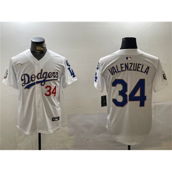 >Men's Los Angeles Dodgers #34 Toro Valenzuela White Gold 2024 World Series With Fernando Memorial Home Limited Stitched Baseball Jersey