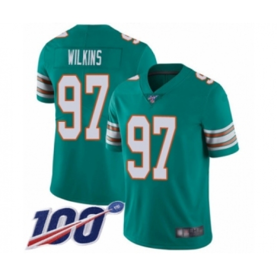 Men's Miami Dolphins #97 Christian Wilkins Aqua Green Alternate Vapor Untouchable Limited Player 100th Season Football Jersey