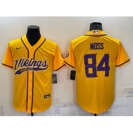 >Men's Minnesota Vikings #84 Randy Moss Yellow With Patch Cool Base Stitched Baseball Jersey