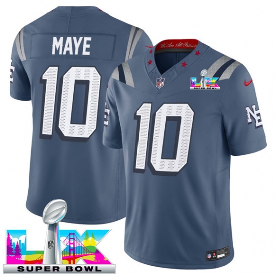 Men's New England Patriots #10 Drake Maye Storm Blue 2025 F.U.S.E. Super Bowl LX “Rivalries” Vapor Limited Football Stitched Jersey
