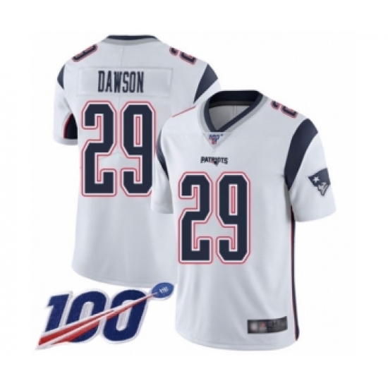 >Men's New England Patriots #29 Duke Dawson White Vapor Untouchable Limited Player 100th Season Football Jersey