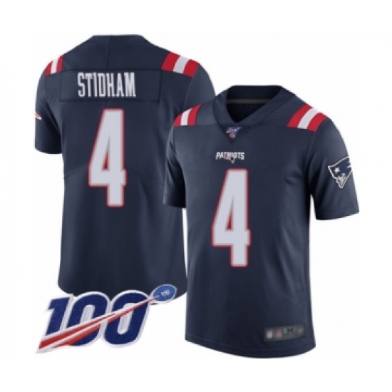 >Men's New England Patriots #4 Jarrett Stidham Limited Navy Blue Rush Vapor Untouchable 100th Season Football Jersey