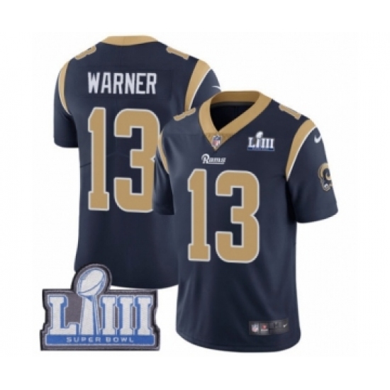 >Men's Nike Los Angeles Rams #13 Kurt Warner Navy Blue Team Color Vapor Untouchable Limited Player Super Bowl LIII Bound NFL Jersey