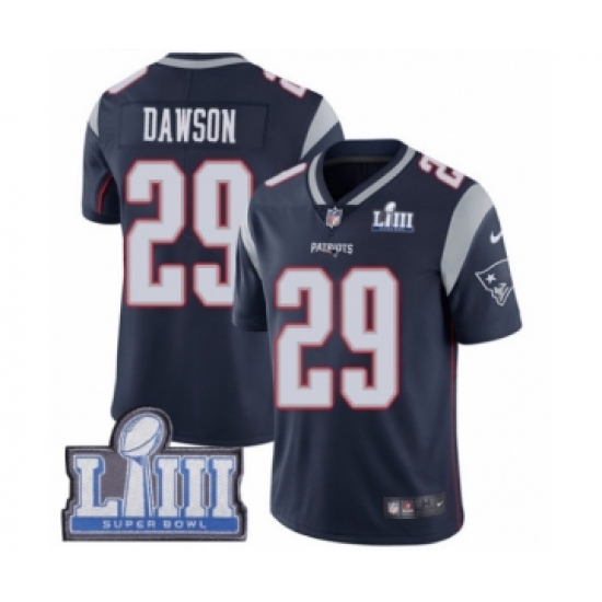 >Men's Nike New England Patriots #29 Duke Dawson Navy Blue Team Color Vapor Untouchable Limited Player Super Bowl LIII Bound NFL Jersey