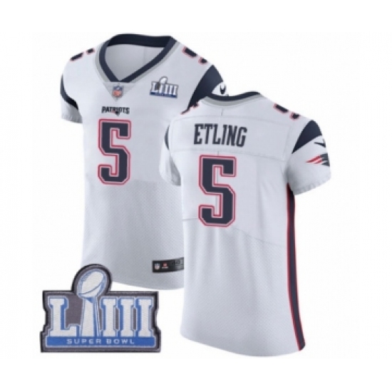 >Men's Nike New England Patriots #5 Danny Etling White Vapor Untouchable Elite Player Super Bowl LIII Bound NFL Jersey