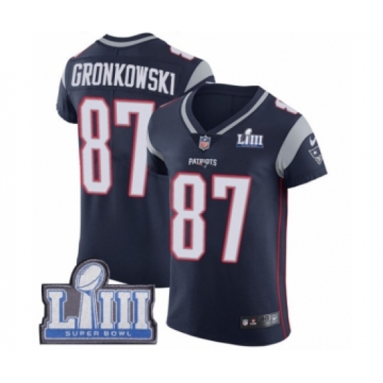 >Men's Nike New England Patriots #87 Rob Gronkowski Navy Blue Team Color Vapor Untouchable Elite Player Super Bowl LIII Bound NFL Jersey