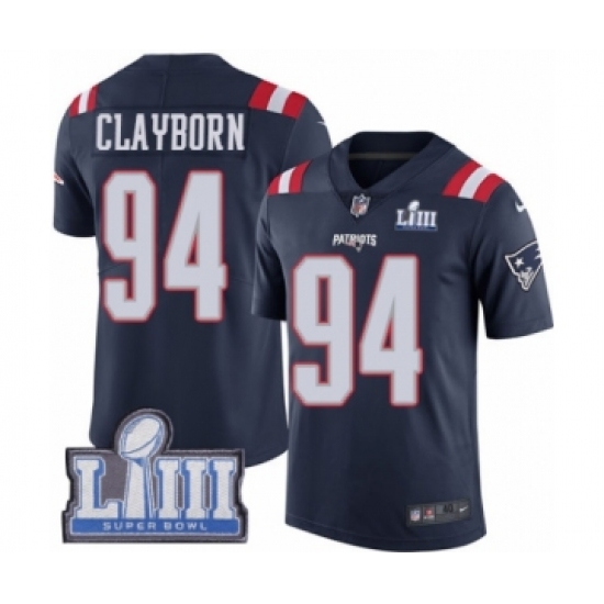 >Men's Nike New England Patriots #94 Adrian Clayborn Limited Navy Blue Rush Vapor Untouchable Super Bowl LIII Bound NFL Jersey