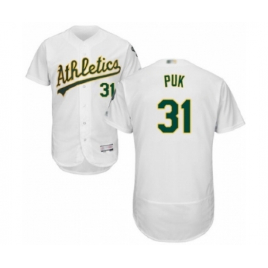 >Men's Oakland Athletics #31 A.J. Puk White Home Flex Base Authentic Collection Baseball Player Jersey