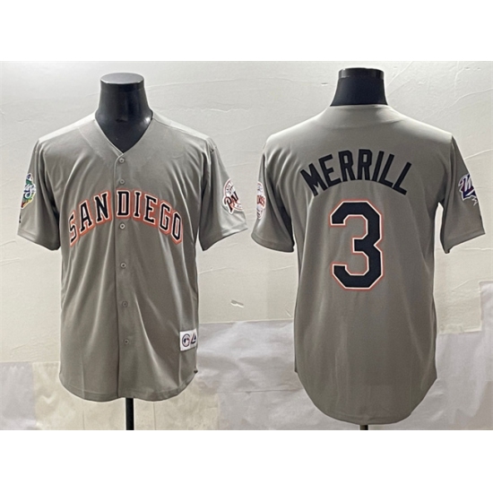 >Men's San Diego Padres #3 Jackson Merrill Gray Fashion Throwback With Cool Base Stitched Jersey