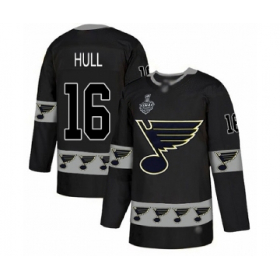 Men's St. Louis Blues #16 Brett Hull Authentic Black Team Logo Fashion 2019 Stanley Cup Final Bound Hockey Jersey