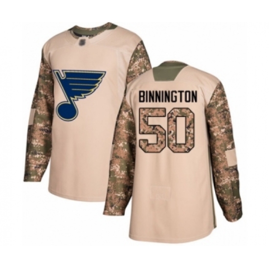 >Men's St. Louis Blues #50 Jordan Binnington Authentic Camo Veterans Day Practice Hockey Jersey
