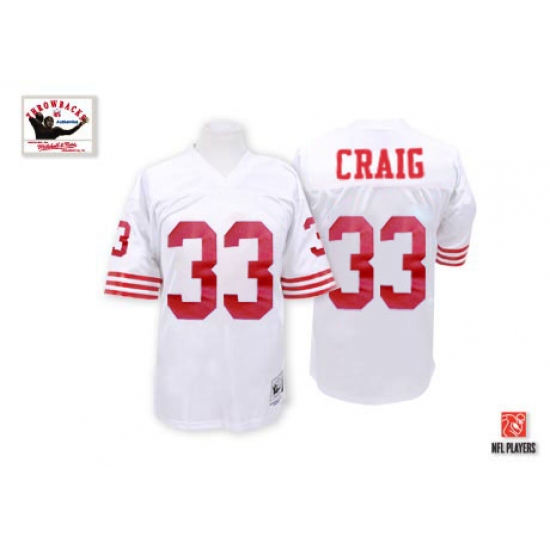 Feel like part of your favorite team by wearing this NFL® Mitchell and Ness San Francisco 49ers #33 Roger Craig Authentic White Throwback NFL Jersey, made of thick, high-quality Pro-Brite fabric for a genuine gridiron look. The players number which 100% stitched is displayed in tackle twill on the chest, back and sleeves, along with the team name on the front. The players name which 100% stitched is displayed on a sewn-down nameplate at the back. 100% Pro-Brite nylon and 100% Pro-Brite polyester for body, 100% lycratalic spandex dazzle for Side Panels/Collar/Cuffs, NFL® Equipment patch sewn on the bottom of the front collar or fabric insert, NFL® Equipment jock tag with numeric sizing is applied to the lower left bottom of the jersey, Reebok® logo embroidered on each sleeve, Officially licensed