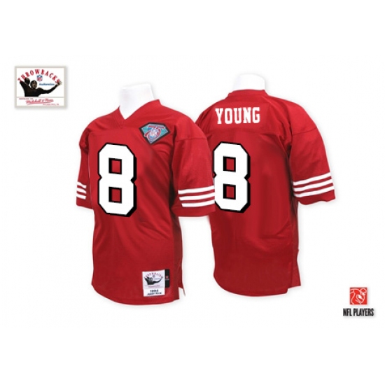 Feel like part of your favorite team by wearing this NFL® Mitchell and Ness San Francisco 49ers #8 Steve Young Red Team Color 75TH Authentic NFL Throwback Jersey, made of thick, high-quality Pro-Brite fabric for a genuine gridiron look. The players number which 100% stitched is displayed in tackle twill on the chest, back and sleeves, along with the team name on the front. The players name which 100% stitched is displayed on a sewn-down nameplate at the back. 100% Pro-Brite nylon and 100% Pro-Brite polyester for body, 100% lycratalic spandex dazzle for Side Panels/Collar/Cuffs, NFL® Equipment patch sewn on the bottom of the front collar or fabric insert, NFL® Equipment jock tag with numeric sizing is applied to the lower left bottom of the jersey, Reebok® logo embroidered on each sleeve, Officially licensed