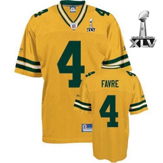 The Reebok Green Bay Packers #4 Brett Favre Yellow 2011 Super Bowl XLV Replica Throwback NFL Jersey by Reebok® is made with quick-drying nylon mesh and designed with screen-printed player and team graphics on the chest, back, sleeves and shoulders. 100% polyester diamond back mesh body, Polyester dazzle sleeves and yoke, Player's number screen-printed on the chest, back and sleeves, Player's name screen-printed at the upper back on a sewn down nameplate, Flat-knit collar with NFL® Equipment patch sewn at the point in the front, Woven jock tag shown at lower left front above the hem, Decorated in the team colors, Officially licensed