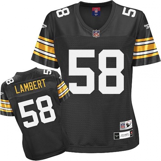The high-quality Reebok Pittsburgh Steelers #58 Jack Lambert Premier Jersey Black Women's Throwback Team Color Premier EQT NFL Jersey is made of heavier fabric, with nylon diamond weave mesh. This team-colored jersey showcases the embroidered NFL® Equipment patch at the point on the v-neck collar and a team specific jock tag at the lower left front above the hem. The officially licensed Premier jersey proudly displays the sewn on, single-layer tackle twill team graphics at the chest, back and sleeves. Players name which is stiched shown at the upper back on a sewn down nameplate, The players number which 100% stitched is displayed in tackle twill on the chest, back and sleeves, NFL® Equipment jock tag shown at lower left front above the hem, Decorated in the team colors, Officially licensed