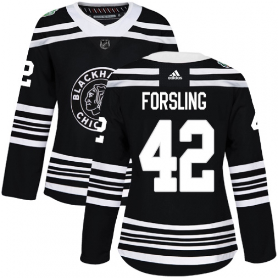 >Women's Adidas Chicago Blackhawks #42 Gustav Forsling Authentic Black 2019 Winter Classic NHL Jersey