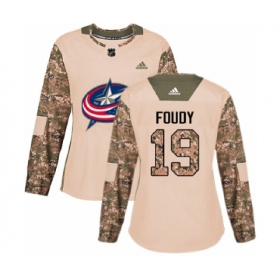 >Women's Adidas Columbus Blue Jackets #19 Liam Foudy Authentic Camo Veterans Day Practice NHL Jersey