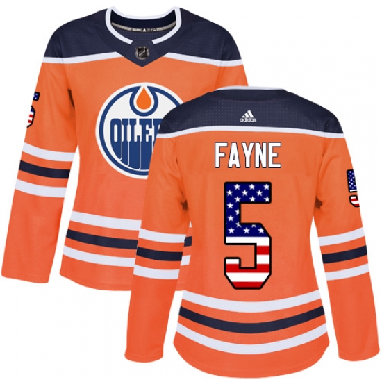 Home>NHL>Edmonton Oilers>Mark Fayne>Women's Adidas Edmonton Oilers #5 Mark Fayne Authentic Orange USA Flag Fashion NHL Jersey