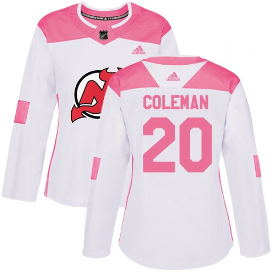 Women's Adidas New Jersey Devils #20 Blake Coleman Authentic White Pink Fashion NHL Jersey