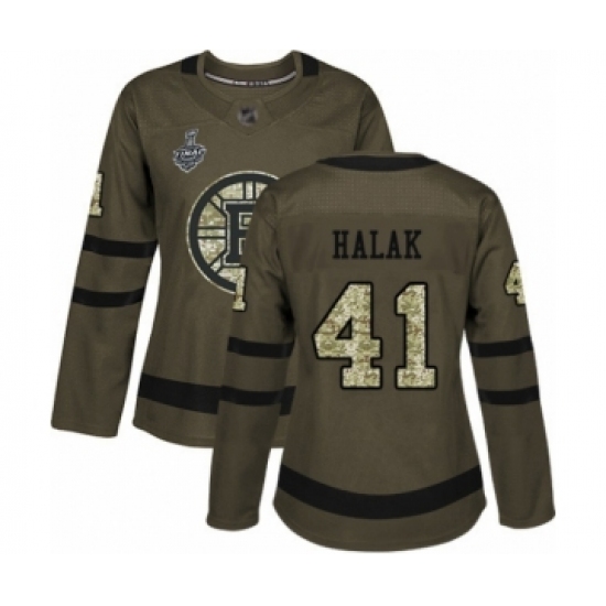 >Women's Boston Bruins #41 Jaroslav Halak Authentic Green Salute to Service 2019 Stanley Cup Final Bound Hockey Jersey