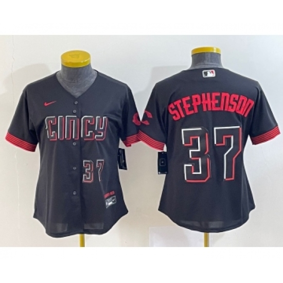 >Women's Cincinnati Reds #37 Tyler Stephenson Number Black 2023 City Connect Cool Base Stitched Jersey2