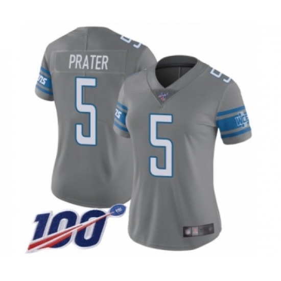 >Women's Detroit Lions #5 Matt Prater Limited Steel Rush Vapor Untouchable 100th Season Football Jersey