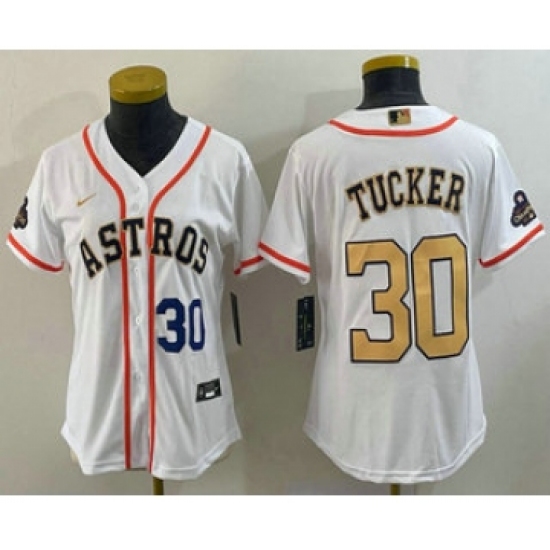>Women's Houston Astros #30 Kyle Tucker Number 2023 White Gold World Serise Champions Cool Base Stitched Jersey