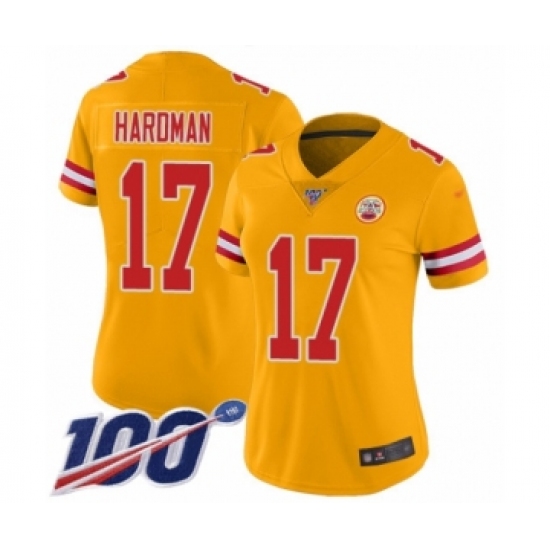 Women's Kansas City Chiefs #17 Mecole Hardman Limited Gold Inverted Legend 100th Season Football Jersey