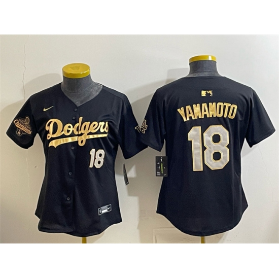 >Women's Los Angeles Dodgers #18 Yoshinobu Yamamoto Black Gold 2025 World Series Champions Limited Stitched Baseball Jersey(Run Small)