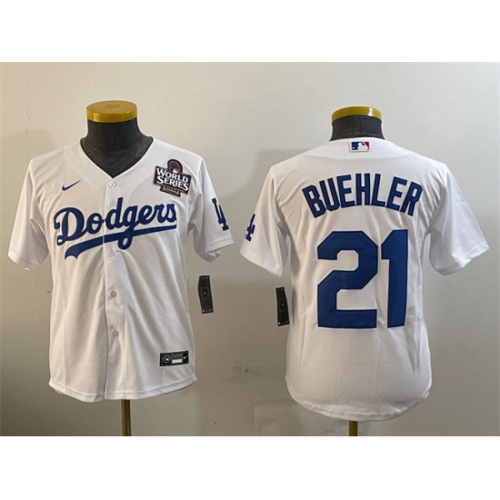 >Women's Los Angeles Dodgers #21 Walker Buehler White 2024 World Series Cool Base Stitched Baseball Jersey(Run Small)