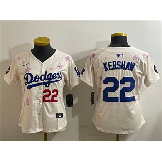 >Women's Los Angeles Dodgers #22 Clayton Kershaw Cream 2025 Tokyo Series Limited Stitched Baseball Jersey(Run Small)