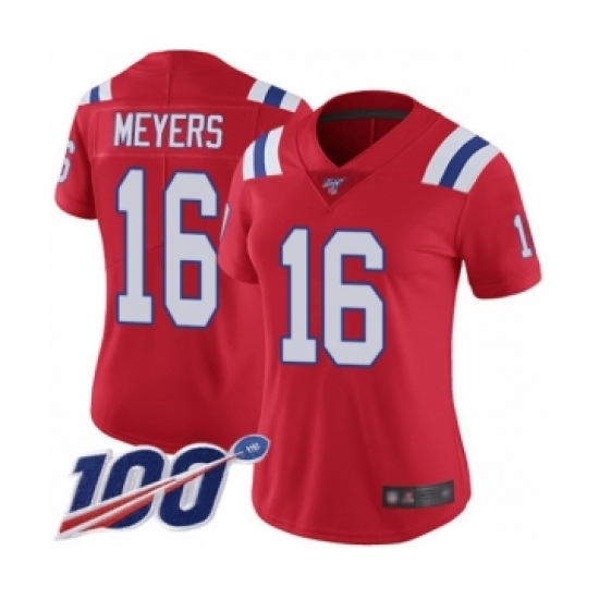 >Women's New England Patriots #16 Jakobi Meyers Red Alternate Vapor Untouchable Limited Player 100th Season Football Jersey