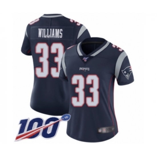 >Women's New England Patriots #33 Joejuan Williams Navy Blue Team Color Vapor Untouchable Limited Player 100th Season Football Jersey