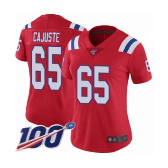 >Women's New England Patriots #65 Yodny Cajuste Red Alternate Vapor Untouchable Limited Player 100th Season Football Jersey
