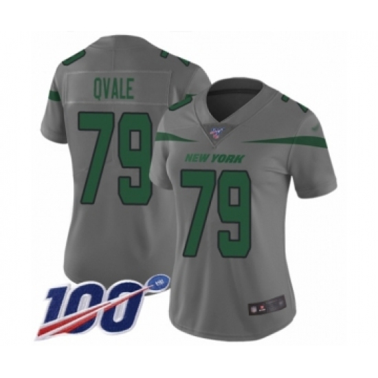 >Women's New York Jets #79 Brent Qvale Limited Gray Inverted Legend 100th Season Football Jersey