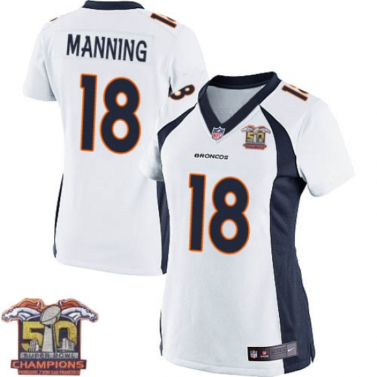 Home>NFL>Denver Broncos>Peyton Manning>Women's Nike Denver Broncos #18 Peyton Manning Elite White Super Bowl 50 Champions NFL Jersey