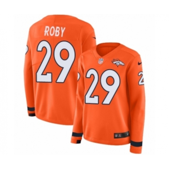 >Women's Nike Denver Broncos #29 Bradley Roby Limited Orange Therma Long Sleeve NFL Jersey