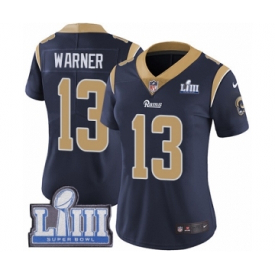 >Women's Nike Los Angeles Rams #13 Kurt Warner Navy Blue Team Color Vapor Untouchable Limited Player Super Bowl LIII Bound NFL Jersey