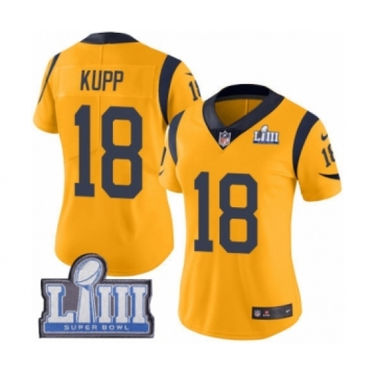 >Women's Nike Los Angeles Rams #18 Cooper Kupp Limited Gold Rush Vapor Untouchable Super Bowl LIII Bound NFL Jersey