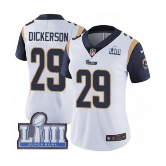 >Women's Nike Los Angeles Rams #29 Eric Dickerson White Vapor Untouchable Limited Player Super Bowl LIII Bound NFL Jersey