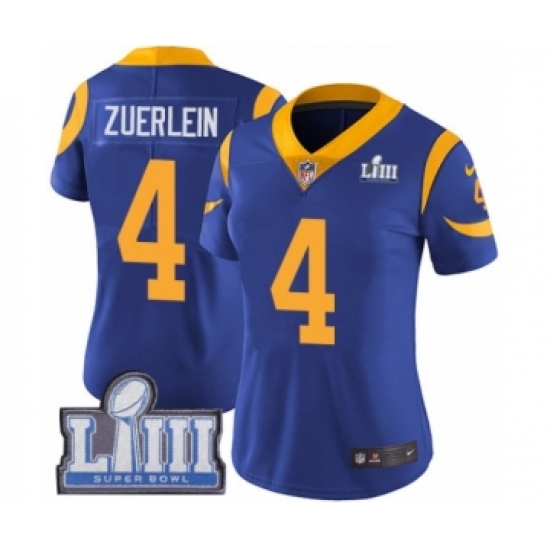 Women's Nike Los Angeles Rams #4 Greg Zuerlein Royal Blue Alternate Vapor Untouchable Limited Player Super Bowl LIII Bound NFL Jersey