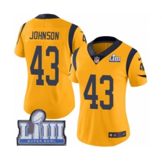 >Women's Nike Los Angeles Rams #43 John Johnson Limited Gold Rush Vapor Untouchable Super Bowl LIII Bound NFL Jersey
